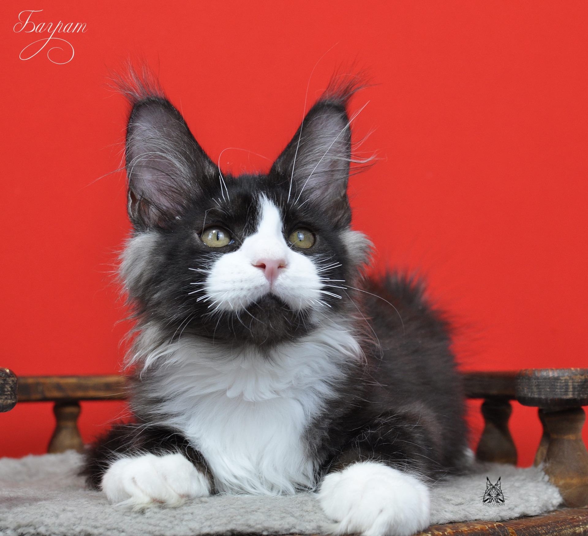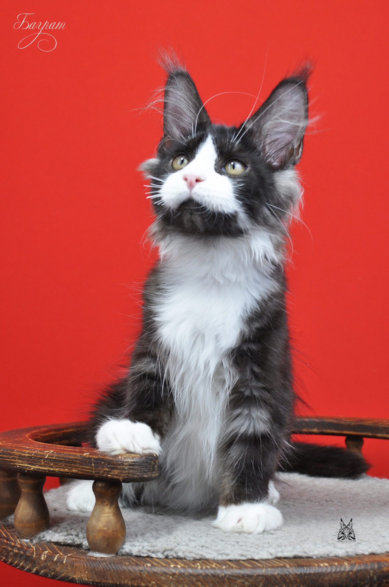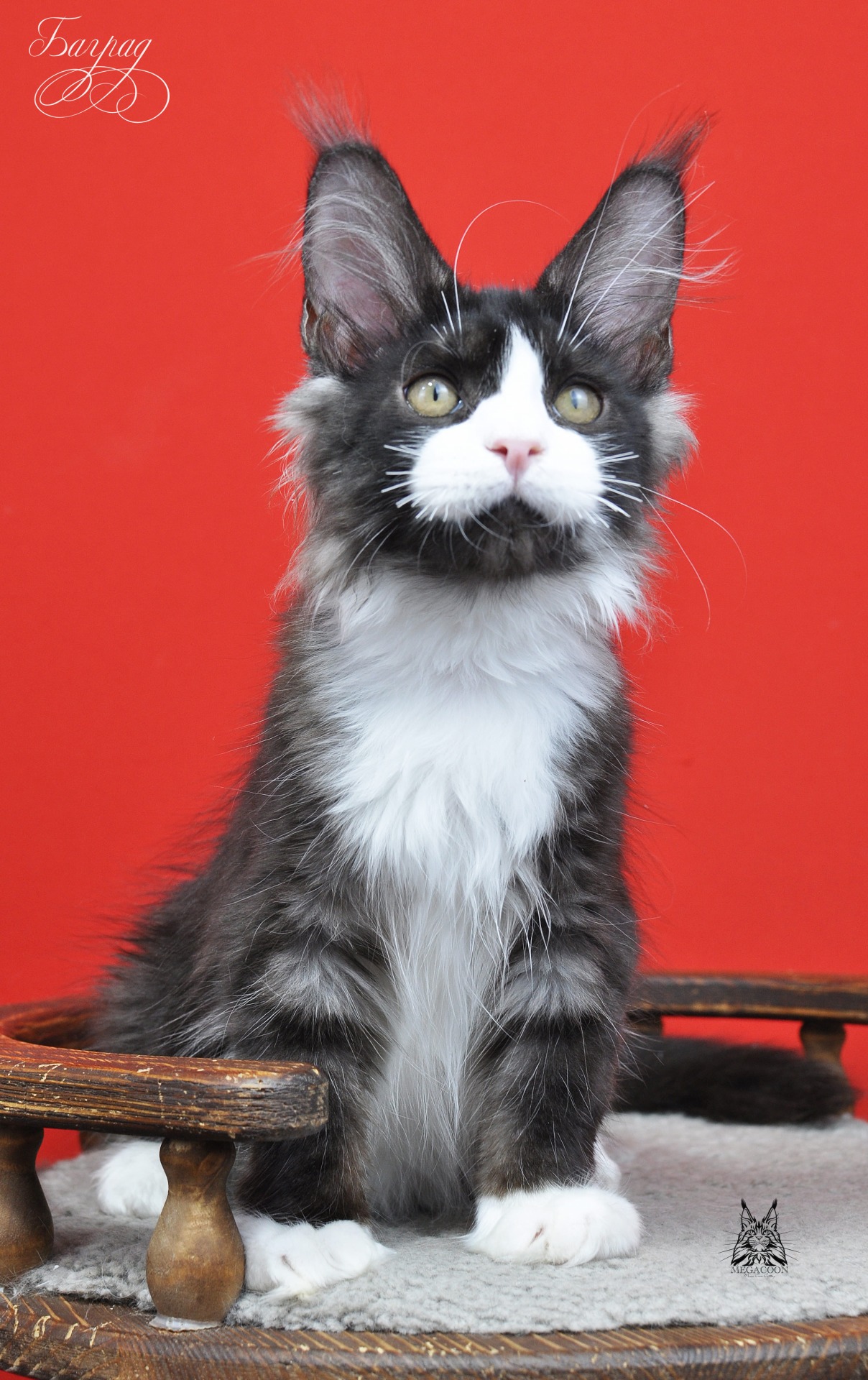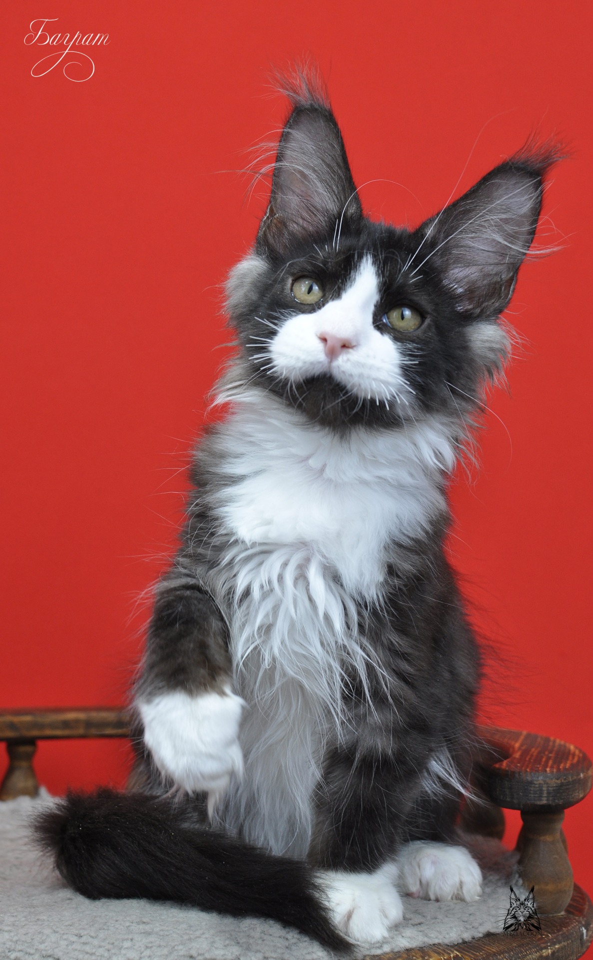 Баграт двойник своего брата Балу. Пацан будит кистястый как и все дети в этом помете. Мама Цея стабильно передает своим отпрыскам свои длинные и густые кисти. Окрас у Баграта называется черный дымный биколорный.